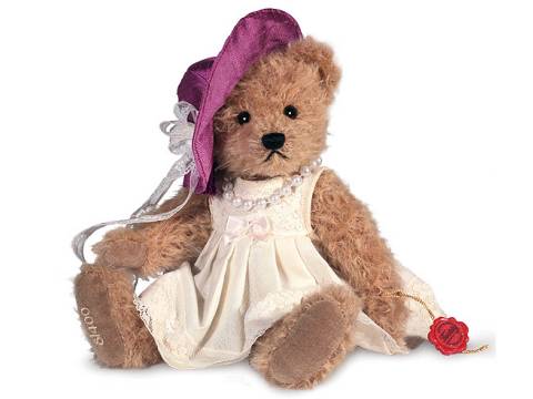Ascot-Lady 30 – limitierte Editon No. 81 von 400 – Design: Traudel Mischner-Hermann Eine richtige, sehr vornehme Bären-Lady im cremefarbenen Kleidchen, mit Perlenkette und selbstverständlich auffälligem Hut, hellbrauner Mohair, 30 cm groß, fünffach gegliedert, Kopf, Arme und Beine sind beweglich – Design Traudel Mischner-Hermann, limitiert auf 400 Stück