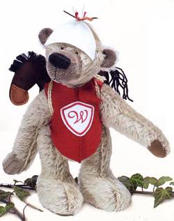 Ritter Winfried 32 – limitierte Editon 500 – Design: Britt Schleusener Ritter Winfried von Teddy Hermann ist 32 cm groß, aus grauem Mohair und mit Watte gefüllt. Er trägt einen samtenen "Harnisch". Sein Pferd hat er auf den Rücken geschnallt.