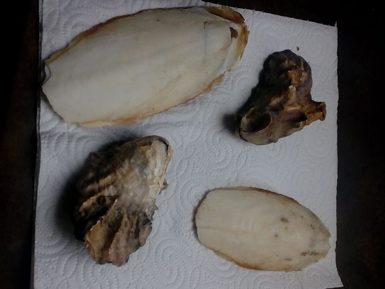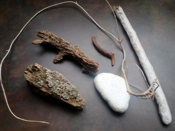 Besonders stolz bin ich auf den Fund zweier Holzstücke, die im Salzwasser sehr porös geworden sind und auf dem einen sich Seepocken niedergelassen haben, die in der Zeit abgestorben sind. Interessant ist auch der weiße Stein, einer weichen Variante des Kalksteins, nämlich Kreide. Im Wasser ist dieser rund geschliffen worden, kann aber weiterhin als Schreibkreide genutzt werden. Woher dieser wohl stammen mag? Die weißen Stöckchen sind wohl im Laufe der Zeit ausgeblichen, das besonders dünne ist dabei ungewöhnlich biegsam und scheint nicht zu brechen zu sein.