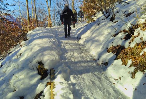 Es ging also bergan eine Serpentine hoch, auf einem schlangenförmig in mehreren engen Kehren angelegten durch Eis sehr glatten Weg am Berghang entlang. So wurden aus den 336 m Höhenunterschied ein Vielfaches an Laufstrecke. Eine Kehre nach der anderen. Dachte ich, wir hätten gleich den Gipfel des Berges erreicht, wurde ich schnell eines Besseren belehrt. Wenigstens gab es dann ab und wann eine Bank zum Verschnaufen.