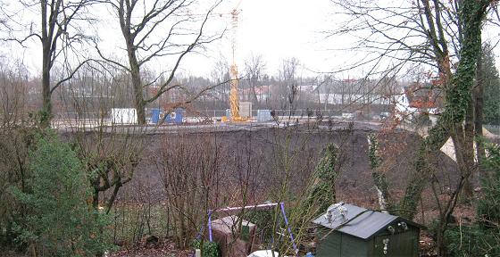 Bei diesen Erdarbeiten wurden auch die für die Bebauung vorgesehenen Flächen ausgehoben und mit Sand gefüllt, also für den späteren Bau der Häuser ‚präpariert‘. Seitdem liegt das Grundstück im Winterschlaf. Immerhin steht auf dem Grundstück schon ein Baukran, der auf baldigen Baubeginn der geplanten Häuser hindeutet.