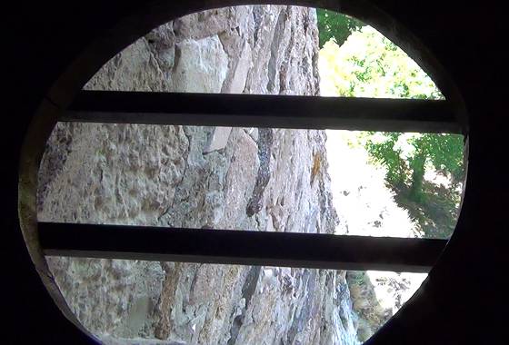 Foto 4: Schloss Oberstein – Willi schaut durch die Öffnung eines ‚Scheißhauses‘