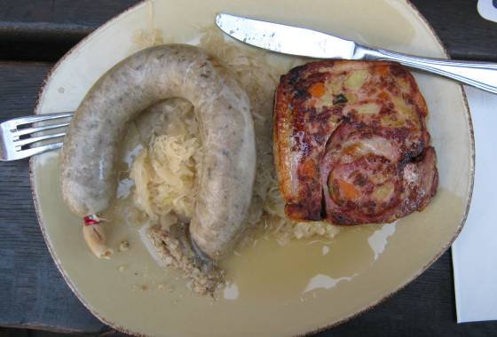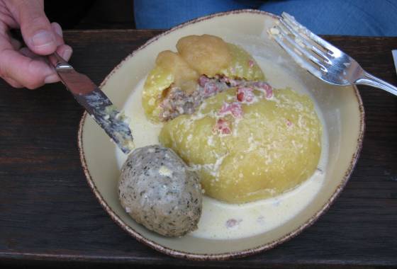 Natürlich teilten wir uns das Essen, um beide in den Genuss aller vier Gerichte zu kommen. Und auch dieses Mal war es uns etwas zu viel des Guten. Geschmeckt hat es auf jeden Fall, wenn unser Fleischbedarf dann auch für die ganze Woche gedeckt war. Meiner Frau fand die gefüllten Klöße am besten (bestehend aus einem Kartoffelmantel, halb und halb, und einer Füllung aus Hackfleisch und Leberwurst), ich fand den Saumagen ganz interessant.