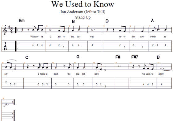 Okay, „We Used to Know“ ist so einfach vielleicht nicht, kein ‚normaler’ Rocktitel mit lediglich drei Akkorden. Aber es ist eines der Lieder, die man von Ian Anderson auch als Amateur noch halbwegs hinbekommt (trotz Barré-Griffe, die aber nichts mit Martin Barre zu tun haben, soviel an Lockwood). Alles in einem durchgängigen ¾-Takt. Also ohne Änderung der Taktart, für Jethro Tull fast schon untypisch.