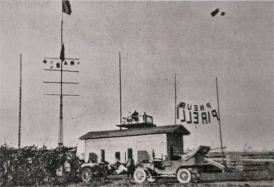 Im Oval: Louis Blériot, der kurz zuvor den Ärmelkanal überquert hatte, fliegt an den Tribünen vorbei. Im unteren Teil vorne rechts ein Curtiss-Flyer, mit dem Curtiss den ‚Großen Preis von Brescia‘ gewann: 50 Kilometer in 49 Minuten und 24 Sekunden.