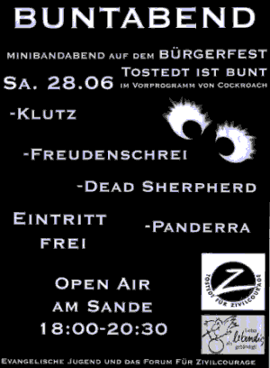 Anlässlich des 3. Bürgerfestes „Tostedt ist bunt“ am 28.06.2008 veranstaltet die Evangelische Jugend Tostedt und das Forum für Zivilcourage einen ‚Minibandabend’ Open Air Am Sande. Im Vorprogramm von „Cockroach“ treten ab 18 Uhr bis 20 Uhr 30 die Gruppen „Klutz“, „Freudenschrei“, „Dead Shepherd“ und „Panderra“ auf. Der Eintritt ist frei.
