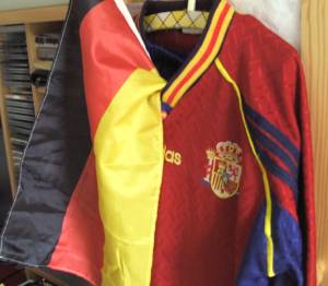 Als ich mit meinen Lieben 1998 in Spanien Urlaub machte, da war gerade die Fußball-WM in Frankreich, die die Gastgeber dann ja auch gewannen. Und überall konnte man die Trikots der teilnehmenden Mannschaft kaufen. Natürlich wollten auch meine Jungs jeder ein Trikot. Lukas, der Jüngere, entschied sich für Brasilien. Und Jan für ein spanisches Trikot, gewissermaßen als Reverenz an das Urlaubsland. Dieses Trikot haben wir nun wieder ausgegraben. Und es hängt jetzt in Lukas’ Fenster … sozusagen als Kompensation zu all den vielen schwarz-rot-goldenen Fähnchen in unserem Land: