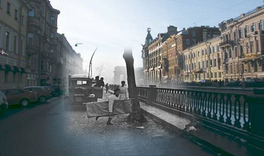 Zuletzt Fotos aus St. Petersburg, die sich mit alten Aufnahmen aus dem früheren Leningrad kreuzen, die aus der Zeit der Belagerung der Stadt von deutschen Truppen vom 8. September 1941 bis zum 27. Januar 1944 stammen: Sankt Petersburg/Leningrad