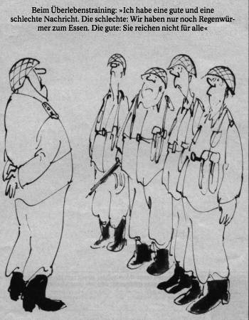 Frage an Radio Eriwan: „Ist es wahr, daß man alle Pilze essen kann?“ „Im Prinzip ja. Einige Pilze nur einmal.“ Zugleich wahr und doch nicht – paradox. Daß alle Witze irgendwie paradox sind, habe ich Ihnen das letzte Mal erzählt. Auch die Darstellung durchs Gegenteil ist eine Spielart des Paradoxen. Fragt die neue Kollegin: „Wie ist denn der Chef?“ „Eigentlich hat er ein ziemlich ausgeglichenes Temperament. Er ist gleichermaßen ekelhaft.“