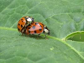 Marienkäfer sind in diesem Jahr sehr zahlreich vorhanden, vielleicht zu zahlreich. In Norddeutschland haben wir geradezu eine Invasion. Das gilt besonders für die asiatischen Marienkäfer (ihre Flügel sind orangefarbend statt rot), die unseren einheimischen Käfern das Leben schwer machen.