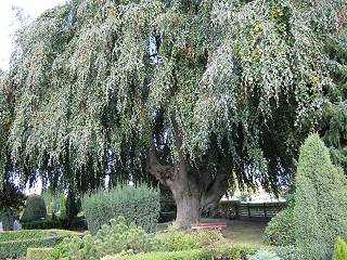 Trauerbuche auf dem Friedhof in Tostedt – bei leichter Bewölkung (oben) und bei Sonnenschein (unten) |