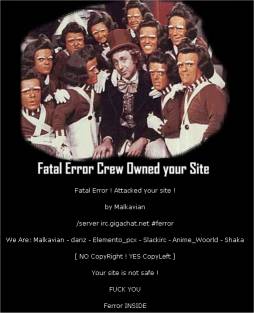 Fatal Error ! Attacked your site ! by Malkavian /server irc.gigachat.net #ferror We Are: Malkavian – danz – Elemento_pcx – Slackirc – Anime_Woorld – Shaka [ NO CopyRight ! YES CopyLeft ] Your site is not safe ! FUCK YOU Ferror INSIDE |