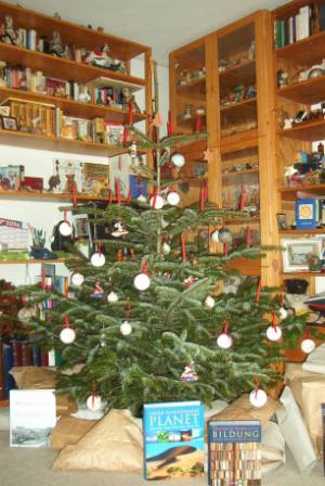 Und zu Weihnachten gehört bei uns ein Tannenbaum dazu, der zunächst eher klein ausfiel, in den letzten Jahren aber ’normale‘ Größe erreichte. Dieser ist mit Kugeln und anderen kleinen Dingen geschmückt (aus unserem Schottland-Urlaub haben wir für diese Weihnachten typischen Schmuck mitgebracht: ein Schaf als Engelchen, Weihnachtsmänner mit Schottenrock). Und es brennen echte Lichter an diesem Baum.