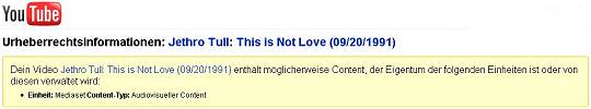 Diesen TV-Mitschnitt hatte ich nun über YouTube veröffentlicht. Eigentlich nichts besonderes, da Jethro Tull hier mit Playback auftritt. Nun machte Mediaset ihre Urheberrechte geltend, das Video wurde entfernt. Es geht dabei um die Fernsehauszeichnung, nicht um die Musik von Jethro Tull selbst, also nicht um die Urheberrechte von Herrn Ian Anderson. Da das die zweite Urheberrechtsbeschwerde zulasten meines YouTube-Kontos ist, führt eine einzige weitere Beschwerde zur Kündigung des Kontos.