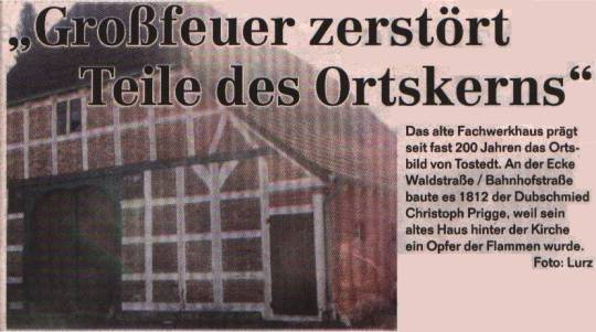Der Dubschmied Prigge ließ sich nicht unterkriegen und begann kurz nach dem Brand mit dem Bau eines neuen Hauses, das bis heute steht. In der Waldstraße, die damals noch ‚Bauerbackhausstraße’ hieß, baute Christoph Prigge sein neues Haus, das 1812 fertig wurde. Genau gegenüber, am jetzigen Standort des Ärztehauses an der Ecke zur Bahnhofstraße entstand seine neue Schmiede. Das Haus von Familie Prigge war damals das überhaupt erste Haus in der Bauerbackhausstraße, dahinter Pferdekoppeln und Kartoffelacker. Auch noch heute ist hinter den Gebäuden eine große Wiese. Sie liegt etwas tiefer als der Rest der Straße, hier wurde früher Sand her genommen für den Kirchenbau, daher ist die Wiese eine Senke. In der Wiese ist ein kleiner Bachlauf zu sehen, der an einer Stelle in der Erde verschwindet. Dies ist die Quelle der Töste! Sie wird am Rand der Wiese in ein Rohr geleitet, fließt dadurch unter den Straßen durch und kommt hinter dem Sande wieder aus dem Boden und ist dort für alle zu sehen.