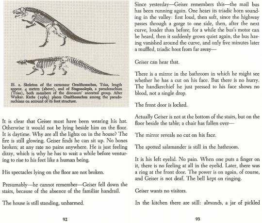 „Mit der phantastischen Wachheit des Einsamen registriert Herr Geiser die kleinen Anzeichen einer denkbaren Katastrophe. Das Tal ist durch Unwetter von der Umwelt abgeschnitten. Gefaßt darauf, daß eines Tages oder in der Nacht, wenn man schläft, der ganze Berg ins Rutschen kommt und das Dorf verschüttet für alle Zeit, liest Herr Geiser im Lexikon, in der Bibel, in Geschichtsbüchern und schreibt ab, was nicht vergessen werden soll. ‚Schlimm wäre der Verlust des Gedächtnisses.’ Dann schneidet er aus, was ihn wissenswert dünkt, und heftet Zettel um Zettel an die Wand. ‚Der Mensch gilt als das einzige Lebewesen mit einem gewissen Geschichtsbewusstsein. / Ob es Gott gibt, wenn es einmal kein menschliches Hirn mehr gibt, das sich eine Schöpfung ohne Schöpfer nicht denken kann, fragt sich Herr Geiser. / Katastrophen kennt allein der Mensch, sofern er sie überlebt; die Natur kennt keine Katastrophen.’ Max Frisch erzählt die letzten Alltage eines Mannes, der begreift, daß er sich abhanden kommt und eingehen wird ins Unbewusstsein der Natur, in Erdgeschichte mit ihren Jahrmillionen. Eine Erzählung ohne Klage, wortkarg-exakt, Satz um Satz bestimmt vom Bewusstsein der Unentrinnbarkeit, auch wenn es schließlich heißt: ‚Das Dorf steht unversehrt. Im August und im September, nachts sind Sternschnuppen zu sehen oder man hört ein Käuzchen.’“