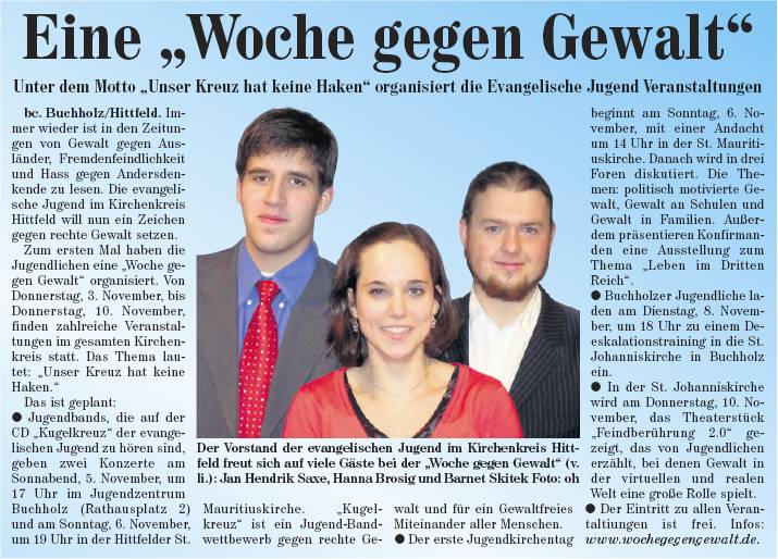 Die evangelische Jugend im Kirchenkreis Hittfeld (das entspricht dem Landkreis Harburg) hat zum ersten Mal vom 3. bis 10. November eine „Woche gegen Gewalt“ organisiert. Damit soll gegen Gewalt, Fremdenfeindlichkeit und Hass gegen Andersdenkende aufgerufen werden (siehe meinen Beitrag: Tostedt – Jugendliche gegen rechte Szene); u.a. findet am Dienstag, den 8.11., in der St. Johannis-Kirchengemeinde in Buchholz, Wiesenstraße 25, von 18 bis 21 Uhr ein Deeskalationstraining statt; am Donnerstag, den 10.11., gibt es an gleicher Stelle um 18 Uhr das Theaterstück „Feindberührung 2.0“. Am Mittwoch, den 9.11., wird ab 18 Uhr in der Tostedter Johanneskirche der Film „American History X“ gezeigt (bitte Hinweis beachten!). Eintritt ist natürlich kostenlos.