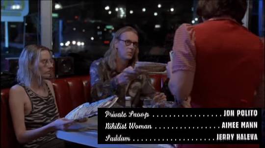 Ein Jahr vor „Magnolia“ kam „The Big Lebowski“ von den Coen-Brüdern in die Kinos mit Jeff Bridges als Jeffrey Lebowski, dem ‚Dude’. In einer Minirolle sehen wir hier Aimee Mann als deutsche Nihilistin sogar auf der Leinwand; in einer Szene bestellt sie Pfannkuchen. Ihr kleiner rechte Zeh spielt in dem Film dagegen eine etwas größere Rolle. In den Credits im Abspann des Films wird ihr Name immerhin vor Saddam aufgeführt, ja genau dem.