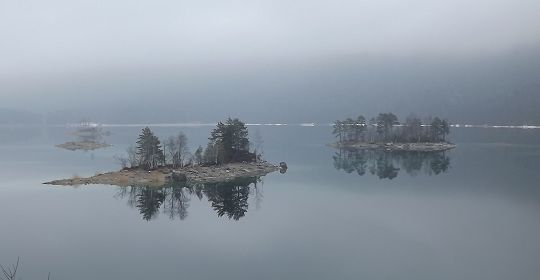 Es war ein nebliger Tag. Der Eibsee, der ansonsten eher durch ein südliche Flair besticht, hüllte sich in dunstige Schwaden. Nach mehreren Ausflügen in die Berge umwanderten wir am 6. Tag unseres Aufenthaltes (5. April) in Grainau den auf rund eintausend Meter hochgelegenen See (samt dem kleinen Frillensee). Die im Eibsee gelegenen Inseln wirkten wie Gespenster. Und am westlichen Rand lag noch Eis aufgetürmt.