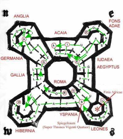 … daß die Bibliothek tatsächlich nach dem Muster des Weltkreises angelegt war. Im Norden lagen die Zonen ANGLIA und GERMANIA, die sich längs der westlichen Außenwand mit der Zone GALLIA verbanden, um dann am äußersten Westrand in die Zone HIBERNIA zu münden und gen Süden überzugehen in die Zonen ROMA (Paradies lateinischer Klassiker!) und YSPANIA. Tief im Süden (das heißt im Südturm) schloß sich die Zone LEONES an, gefolgt von AEGYPTUS und weiter östlich fortgesetzt von IUDAEA und schließlich FÖNS ADAE. Zwischen Osten und Norden erstreckte sich längs der Außenwand die Zone ACAIA – eine treffliche Synekdoche, wie mein Meister sich ausdrückte, um das alte Griechenland zu bezeichnen, und tatsächlich fanden wir in jenen Räumen eine Fülle von Werken heidnisch-antiker Dichter und Philosophen.