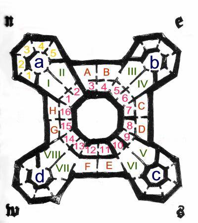 Ich versuchte es, entwarf den Grundriß nach den Angaben meines Meisters und stieß einen Freudenschrei aus. »Jetzt wissen wir alles! Laßt mich einmal zählen . . . Ja, die Bibliothek hat sechsundfünfzig Räume, vier siebeneckige [a-d, dunkelblau] und zweiundfünfzig mehr oder minder quadratische, von denen acht fensterlos sind [I-VIII, dunkelgrün], während achtundzwanzig nach außen [4x 1-5, gelb / A-H, braunrot] gehen und sechzehn nach innen [1-16, weinrot]!«