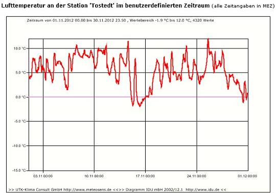 Nein, ich will hier keine Trübsal blasen. Noch hat der November seine guten, herbstfarblichen Seite. Und mancher Herbst hat sich auch als sonnig, als eine Art verspäteter goldener Oktober (also goldener November) erwiesen. Ich blicke gern zurück (nein, nicht im Zorn) und habe geschaut wie z.B. der November vor einem Jahr war. Im Großen und Ganzen entsprach er dem Obengenannten. Er begann verregnet und stürmisch (daher früher ja auch Windmond genannt). Es gab dann einige Tage, an denen sich auch schon ’mal die Sonne blicken ließ. Zur Mitte hin kam Frost auf – und Nebel. Weiterhin Regen, dann am letzten Tag den ersten Schnee. Die Quecksilbersäule kam übrigens im November 2012 bei uns in Tostedt/Niedersachsen nicht über 12,0 ° C hinaus. Dafür hatten wir eine Tiefsttemperatur von -1,9 ° C.