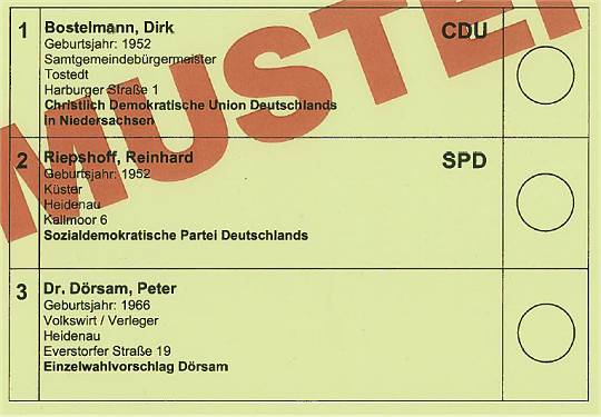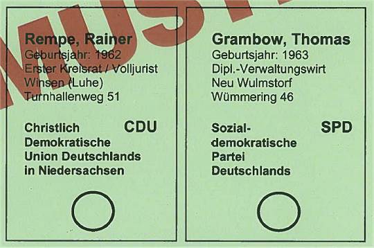 Weitere Informationen zu den Samtgemeindebürgermeister- und Landratswahlen in meinem Wohnort Tostedt siehe: Samtgemeindebürgermeister- und Landratswahl