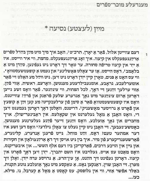 Bevor am Schluss in dem kleinen, gerade einmal gut 130 Seiten umfassendem Buch der Einleitungsvortrag über Jargon von Kafka dessen Gedanken zur jiddischen Sprache kundgetan werden (Kafka spricht von Jargon, wenn er die jiddische Sprache meint), findet sich eine kleine Erzählung von Sholem Yankev Abramovitsh unter seinem Autorennamen Mendele Moykher Sforim, die zunächst in deutscher Übersetzung (übersetzt gemeinsam von Susanne Klingenstein und Martin Walser), dann in der Transliteration und zuletzt in hebräischer Schrift wiedergegeben wird. Hier der erste Absatz.