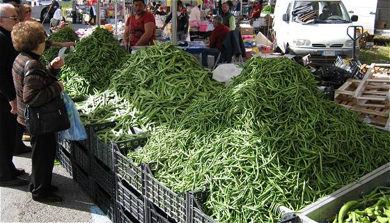 Wir wurden nicht nur herumgereicht, sondern unternahmen auch einige Touren mit einzelnen von Euch. Nach der Fahrt nach Marina di Ragusa ans Meer am 1. Mai (später dazu etwas mehr) besuchten wir den Wochenmarkt in Vittoria, dem Nachbarort. Auch wenn es viele von uns nicht wissen, aber viele Produkte der Landwirtschaft (vor allem die kleinen Tomaten) finden bis auf unseren Tisch den Weg aus Vittoria zu uns. So wundert es keinen, wenn man das Angebot an Gemüse, aber auch an Fisch und Käse (z.B. der Ragusano in Quaderform oder der birnenförmige Caciocavallo), zu sehen bekommt. Gerade Bohnen (als grüne oder dicke Bohnen) sind zz. im Angebot. Orangen gibt es zwar auch noch, aber die werden eigentlich im Winter geerntet. Dafür gibt es Zitronen das ganze Jahr über (an den Zitronenbäumen zeigen sich reife Früchte neben neuen Blüten gleichzeitig). Die sizilianische Küche gilt aus die älteste und vielseitigste Küche Italiens. Die Zutaten bekommt man am besten auf dem Markt.