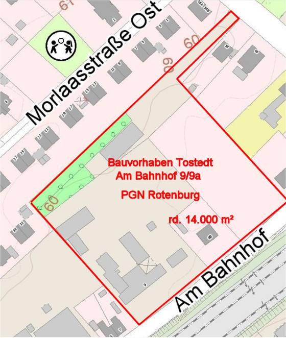 Ein weiterer Knackpunkt ist die geplante Zuwegung von der Poststraße her. Die Bauplanung der PGN sieht hier eine etwa 5,50 m breite, zweispurige Straße vor, die ganz dicht an den angrenzenden Häusern in der Poststraße und den ersten fünf Häusern in der Morlaasstraße Ost entlang führen soll, sodass die Anwohner dort dann vorn wie hinten eine Straße hätten – und das bei diesen kleinen Grundstücken: eine Zumutung! Eine frühere Planung (durch den alten Eigentümer) hatte diese Zuwegung nicht vorgesehen. Zudem stellt sich die Frage, ob diese Straße nicht auch Teil einer etwa 9 m breiten Grünzone (Fläche mit Bindung für Bepflanzung und für den Erhalt von Bäumen und Sträuchern – § 9 Abs. 1 Nr. 25b BauGB) ist, die zwar zum größten Teil auf den Grundstücken in der Morlaasstraße Ost liegen, aber mit etwa anderthalb Meter Breite ein Teil der geplanten ‚Straße‘ wären (siehe den Ausschnitt aus dem Bebauungsplan rot begrenzt in der folgenden Grafik). Eine Nutzung als Gehweg wäre sicherlich am sinnvollsten, zumal es solche Gehwege viele in Tostedt gibt (Birkenweg, Gerbersteg usw.).